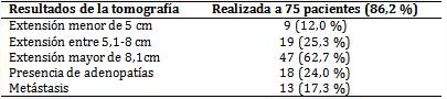 En la serie se realizó la TC a 75 pacientes, para una frecuencia relativa de 86,2 %. En 9 (12,0 %) se identificó la presencia del tumor con una extensión menor de 5 cm, en 25,3 %, entre 5,1 y 8 cm y en 62,7 %, mayor de 8,1 cm; 24,0 % de los afectados presentaron adenopatías en el mediastino y 17,3 %, metástasis (tabla 5).