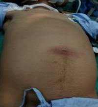 El cirujano de guardia evaluó al paciente y en el examen físico fue notable el abdomen globuloso (bazo palpable), no doloroso, con hematoma periumbilical (signo de Cullen) y múltiples adenopatías supraclaviculares (fig. 1).