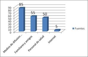 En la figura se observa que todos los encuestados habían recibido información acerca de la lactancia materna exclusiva. Los medios de difusión masiva, seguidos de los familiares y amigos fueron las fuentes de información más reconocidas por los encuestados, con 85,0 y 55,0 %, respectivamente.