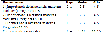 Para evaluar el nivel de conocimientos se aplicó un cuestionario elaborado por los autores, previamente revisado por expertos en el tema. Dicho instrumento estuvo conformado por 15 preguntas con una alternativa de respuesta, las cuales evaluaron 3 dimensiones, cada una con puntaje de 1 para las respuestas correctas y 0 para las incorrectas.