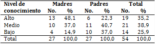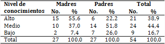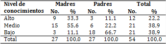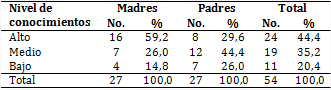 Como se muestra en la tabla 2, la mayoría de los integrantes de la serie (24, para 44,4 %) mostraron conocimientos altos sobre los beneficios de la lactancia materna exclusiva, los que resultaron superiores en las madres (16, para 59,2 %) respecto a los padres (8, para 29,6 %); en tanto, estos últimos mayormente alcanzaron niveles medios de conocimientos (12, para 44,4 %).