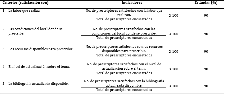 En cuanto a la satisfacción de los prescriptores se establecieron los criterios, indicadores y estándares declarados a continuación: