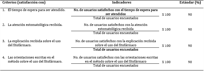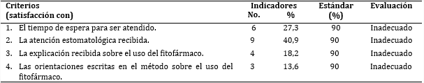 Del total de usuarios que participaron en la investigación (22), más de 50,0 % refirió insatisfacción con el tiempo de espera para ser atendido (72,7 %) y con la atención estomatológica recibida (59,1 %). Igualmente, más de 80,0 % refirió no estar satisfecho con la explicación recibida sobre el fitofármaco prescrito (81,8 %) y con las orientaciones escritas en el método sobre su uso (86,4 %).