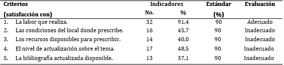 Al evaluar la satisfacción de los prescriptores (tabla 1), se observó que en un solo criterio (satisfacción con la labor que realiza) el indicador superó discretamente (91,4 %) el estándar prefijado. En cambio, en los criterios restantes los indicadores alcanzaron porcentajes por debajo de 50,0 %.