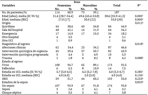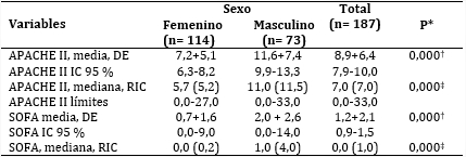 Resultados: En la investigación la mayoría de los pacientes correspondieron al sexo femenino (60,9 %) y la edad media fue de 31,6 y 49,6 años en mujeres y hombres, respectivamente (p=0,000). Asimismo, existieron diferencias significativas en cuanto al origen (p=0,012) y los diagnósticos iniciales (p=0,018); mientras que el promedio del APACHE II resultó ser de 7,2 en mujeres y de 11,6 en hombres (p=0,000) y la escala para la evaluación de fallo orgánico secuencial tuvo una media de 0,7 y 2,0, en ese mismo orden (p=0,000).