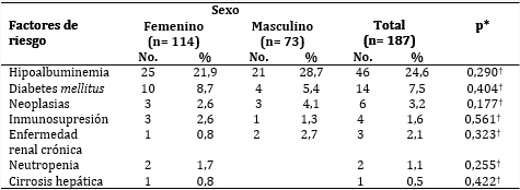 Los factores de riesgo predominantes en ambos sexos (tabla 3) resultaron ser la hipoalbuminemia (p=0,290), la diabetes mellitus (p=0,404) y las neoplasias (p=0,177); diferencias estas que no fueron significativas.