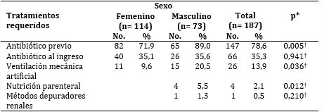 La frecuencia de tratamiento requerido se refleja en la tabla 4, donde se impone destacar que el porcentaje de varones con antibiótico previo (89,0), ventilación mecánica artificial (20,5) y nutrición parenteral (5,5) fue significativamente mayor.
