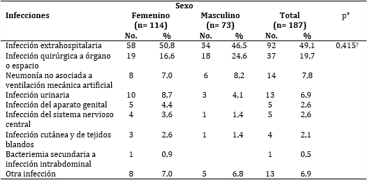 Las infecciones extrahospitalarias (tabla 5) se presentaron en 50,8 % de las mujeres y en 46,5 % de los hombres; valores que no mostraron diferencias significativas (p=0,415). No obstante, en estos últimos se encontró mayor frecuencia de neumonía no asociada a la ventilación mecánica artificial (8,2 %) y en las féminas, de infección urinaria (8,7 %) y del aparato genital (4,4 %).