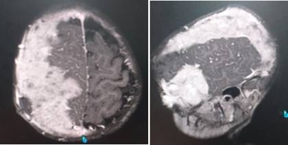 Resonancia magnética simple de cráneo: Se observó imagen extraaxial hemisférica del lado derecho, de contornos polilobulados, isointensa en T1, con áreas hiperintensas por zonas de sangrado subagudo temprano, y ligeramente hiperintenso en T2 y FLAIR (siglas del inglés fluid-attenuated-inversion-recovery), asociada a cambios de intensidad de señales en la estructura ósea adyacente y en el ala mayor del esfenoide de este lado; igualmente, se apreció engrosamiento del tejido subgaleal ipsilateral, que comprimía el tejido cerebral adyacente y los ventrículos laterales, y desplazaba 10 mm las estructuras de la línea media hacia el lado contralateral, además de signos de hipertensión intracraneal y edema cerebral difuso. En su crecimiento, dicha imagen penetraba en la órbita derecha hacia el tejido graso extraconal, de manera que comprimía e infiltraba el músculo recto lateral y provocaba proptosis, que englobaba e infiltraba a los músculos recto, oblicuo y elevador del párpado (fig. 1).