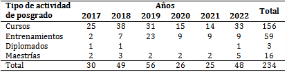 En cuanto al tipo de actividad de posgrado, en la tabla 1 se aprecia el predominio de los cursos en todos los años y la poca disponibilidad de diplomados como opciones de superación.