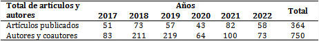 Por otra parte, el año con mayor número de autores y coautores en la Revista Cubana de Tecnología de la Salud fue el 2019, mientras que los artículos publicados preponderaron en el 2021 (tabla 2).