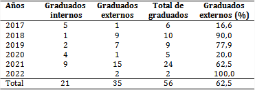 En la tabla 3 se observa que la cifra de doctores en ciencias se incrementó en el 2021 (62,5 %), con predominio de los graduados externos, incluido el primer extranjero (procedente de Chile).