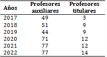 Igualmente, se incrementó el número de profesores de la FATESA que promovieron a la categoría docente superior, pues de 49 profesores auxiliares y 3 titulares en el 2017 aumentó a 77 y 14, respectivamente, en el 2022 (tabla 5).