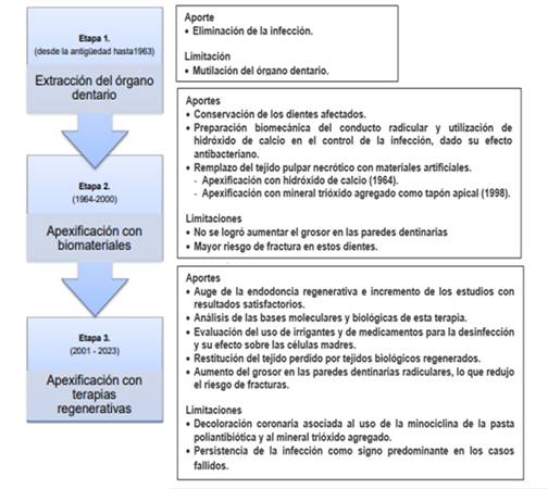 Como resultado del análisis histórico-lógico fueron identificados los siguientes hitos: introducción de los biomateriales en la práctica clínica estomatológica y surgimiento de la endodoncia regenerativa. Estos acontecimientos permitieron establecer 3 etapas en el tratamiento de dientes permanentes inmaduros necróticos, cada una con sus aportes y limitaciones.