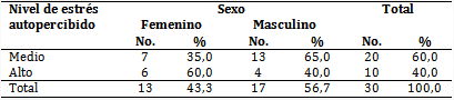 En la tabla 1 se evidencia el predominio del nivel de estrés medio en el sexo masculino (65,0 %) y alto en el femenino (60,0 %).