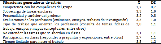 El tiempo limitado para hacer el trabajo (X̅=3,5), seguido de las evaluaciones de los profesores y la sobrecarga de tareas escolares (X̅=3,3, respectivamente) fueron las situaciones generadoras de estrés preponderantes (tabla 2).