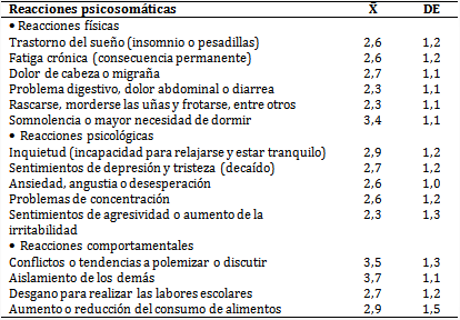 Por su parte, la somnolencia o mayor necesidad de dormir (X̅=3,4), la inquietud (X̅=2,9), el aislamiento de los demás (X̅=3,7) y los conflictos o las tendencias a polemizar o discutir (X̅=3,5) resultaron ser las principales reacciones en los estudiantes (tabla 3).