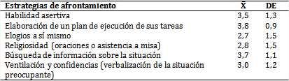 Según se aprecia en la tabla 4, las estrategias de afrontamiento más usadas por los estudiantes fueron la elaboración de un plan de ejecución de sus tareas (X̅=3,8), la búsqueda de información sobre la situación (X̅=3,7) y la habilidad asertiva (X̅=3,5).
