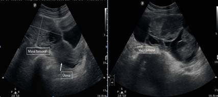 Al efectuar el examen físico se palpó una masa de consistencia firme y dolorosa, con matidez a la percusión, que se extendía hasta la región umbilical.
