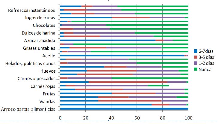 Durante el tiempo evaluado, 89,5 % indicó que nunca consumieron oleaginosas, 76,1 % grasa animal (manteca), 59,7 % carnes o pescado en conservas, entre otras.