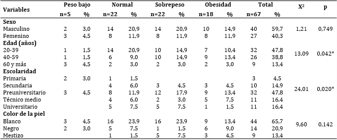 De acuerdo con las categorías de clasificación del estado nutricional según el índice de masa corporal (IMC) y el género, solo 5 pacientes: 3 mujeres (4,5 %) y 2 hombres (3,0 %), tenían peso bajo. El IMC fue adecuado en 14 hombres (20,9 %) y 8 mujeres (11,9 %). Existió sobrepeso global, que incluyó a los sujetos con sobrepeso y obesos (59,7 %). Se observó una relación significativa del estado nutricional con todos los grupos de edades (χ2=13,09; p=0,042*) y la escolaridad (χ2=24,01; p=0,020*).