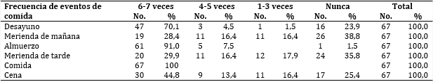 En la tabla 2 se muestra que la mayoría de los sujetos realizaba las 3 comidas principales del día: desayuno (70,1 %), almuerzo (91,0 %) y especialmente la comida (100,0 %); sin embargo, la frecuencia de ingesta de las meriendas fue inferior, con 28,4 % en la mañana, 29,9 % en la tarde y 44,8 % en la cena, consumidas de 6 a 7 veces a la semana. Los sujetos que realizaron entre 5 y 6 comidas todos los días constituyeron menos de la mitad.