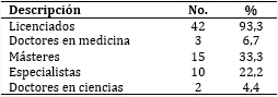 Respecto a la formación de los docentes (tabla), se observó un predominio de los que procedían del sector de la salud (42, para 93,3 %) en relación con los graduados por el Ministerio de Educación Superior (3, para 6,7 %).