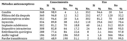 Al indagar en el uso y conocimiento de la variedad de los métodos anticonceptivos existentes, los más conocidos por las encuestadas fueron el condón y la píldora del día después, mientras que los menos conocidos resultaron ser el anillo vaginal y el parche transdérmico (tabla 1).