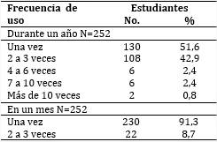 Los hallazgos de esta serie concordaron con los que preceden, pues se obtuvo un predominio de las estudiantes que utilizaron la anticoncepción de urgencia una única vez, tanto en un año como en un mes; sin embargo, se evidenció que algunas jóvenes la habían consumido más de 4 veces en el año y que una cifra superior había reemplazado los anticonceptivos de uso rutinario por los de emergencia.