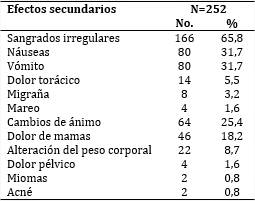 Results: In the series, 67.7% of the young women had used emergency contraceptives, of whom 8.7% reported consuming up to 3 levonorgestrel pills per month and 0.8% more than 10 during a year, while 97.8% considered that this type of method affects their health. Among the main adverse effects were irregular periods (65.8%), nausea (31.7%), vomiting (31.7%), migraine (3.2%) and mood changes (25.4%).