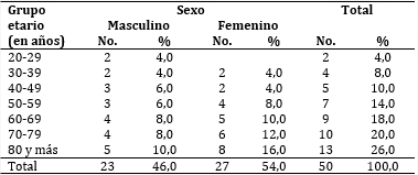 En la serie (tabla 1) predominó el grupo de 80 y más años (13 pacientes, para 26,0 %), así como el sexo femenino (59, para 54,0 %).