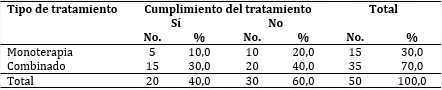 Al evaluar el tipo de tratamiento se halló predominio del combinado (35 pacientes, para 70,0 %) en relación con la monoterapia. Cabe señalar que 60,0 % de la muestra no cumplía con el plan terapéutico indicado (tabla 2).