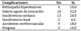 Al analizar las complicaciones (tabla 3), se encontró mayor frecuencia del infarto agudo de miocardio (32,0 %), seguido de la insuficiencia cardíaca (26,0 %) y de los accidentes cerebrovasculares (18,0 %).