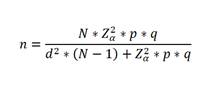 De donde N es el tamaño de la población, Z, nivel de confianza; p, probabilidad de éxito o proporción esperada; q, probabilidad de fracaso y d, precisión o error máximo admisible en términos de proporción.