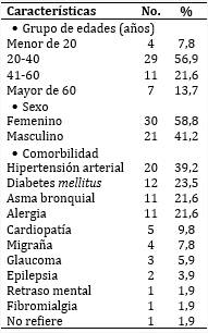 Como se aprecia en la tabla 1, primaron el grupo etario de 20 a 40 años (56,9 %), el sexo femenino (58,8 %) y la hipertensión arterial (39,2 %) como comorbilidad asociada. De la serie, solo un sujeto no presentaba enfermedad crónica alguna.