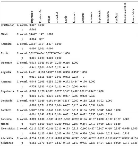 El estrés fue el síntoma que más se correlacionó con los demás, a diferencia de la impotencia que no se correlacionó con ningún otro. La ansiedad fue otro de los más vinculados con la depresión, el miedo, el estrés y la ansiedad; la frustración se relacionó con la ansiedad y el estrés; en tanto, el miedo se vinculó con la ansiedad y el estrés, y así sucesivamente en cada uno (tabla 3).