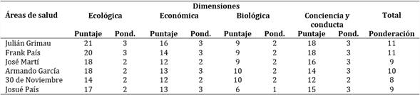 La clasificación de las áreas según condiciones de vida se observa en la tabla 1. Los mayores puntajes ponderados se computaron para las áreas de salud Julián Grimau y Frank País, con 11 puntos, seguido del área Armando García, con 10 puntos. Las ponderaciones más bajas las obtuvieron los centros asistenciales 30 de Noviembre, José Martí y Josué País, 8 puntos la primera y 9 para las dos restantes, respectivamente.