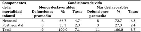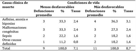 Resultados: Se estratificaron ambos distritos poblacionales, según sus condiciones de vida, en asentamientos con condiciones de vida menos desfavorables y más desfavorables. Se estimó mayor mortalidad infantil en el asentamiento con condiciones de vida más desfavorables (8,7 fallecidos por 1000 nacidos vivos), donde predominaron como causas clínicas de muerte las asfixias, la anoxia e hipoxias y causas clínicas reducibles por buena atención en el parto.