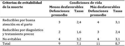 El asentamiento con condiciones de vida más desfavorables identificó riesgos superiores para las muertes reducibles por buena atención en el parto y las reducibles por diagnóstico y tratamiento precoz, con tasas de 3,1 y 2,4 defunciones por 1000 NV, respectivamente. Las causas difícilmente evitables fueron prácticamente similares en ambos asentamientos (tabla 4).