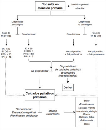 El algoritmo inicia en la consulta médica (figura) cuando se sospecha la existencia de una enfermedad en etapa avanzada. Si se tratara de una entidad neoplásica, se sugiere el uso del índice de Karnofsky (IK), la escala de actividad según el ECOG (Eastern Cooperative Oncology Group), la escala funcional paliativa (PPS, por sus siglas del inglés Palliative Performance Scale) y el índice pronóstico paliativo (PPI, por sus siglas del inglés Palliative Prognostic Index); si fuera una afección no neoplásica, se propone aplicar la escala de necesidad paliativa (NECPAL) de la Sociedad Española de Cuidados Paliativos.
