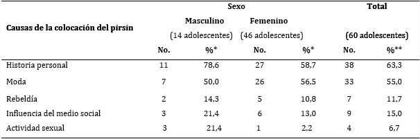 En la tabla 1 se observa que la historia personal y la moda fueron las principales causas que motivaron la colocación del pirsin, presentes en 63,3 y 55,0 %, respectivamente. Aunque estas causas tuvieron mayor frecuencia en ambos sexos, se destaca que en 78,6 % de los varones la colocación del pirsin fue el antecedente de historia personal.