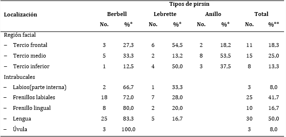 Con respecto al tipo de pirsin, se identificó que en los que se encontraban en los tercios frontal e inferior de la región facial fue más frecuente el Berbell, mientras que en el tercio medio, el anillo. En los intrabucales predominó el Berbell, independientemente de su localización.