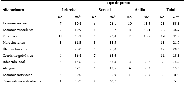Resultados: Se halló que por cada 100 escolares, 6 llevaban pirsin y 76,8 % eran féminas. Las localizaciones intrabucales predominaron en la lengua (50,0 %) y los frenillos labiales (41,7 %). Se identificaron alteraciones orofaciales locales, tales como las lesiones en piel (38,3 %) y vasculares (36,7 %), así como la sialorrea (31,7 %). Los problemas funcionales estuvieron representados por trastornos del habla (21,7 %).