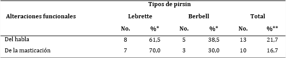 En cuanto a las alteraciones funcionales (tabla 4), solo se identificaron trastornos del habla en 13 adolescentes y de la masticación en 10, todas asociadas con portadores de pirsin de lebrette y berbell. No se notificó cambio en la respiración. Además, en aquellos que tenían pirsin de tipo anillo no se identificó ningún tipo de trastorno funcional.