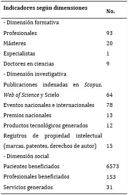 Resultados: La dimensión formativa mostró los profesionales formados en diversas carreras universitarias (93) y la formación posgraduada de másteres, especialistas y doctores en ciencia (30). La dimensión investigativa reveló 64 publicaciones en revistas de impacto, 78 presentaciones en eventos nacionales e internacionales, 13 premios, 12 productos tecnológicos y 15 registros de propiedad intelectual. La dimensión social expuso 31 servicios de salud relacionados, 6 573 pacientes y 133 profesionales beneficiados.
