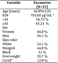 Results: The average age was 45.89± 3.35 years, in a range of 27 to 62 years. The female sex predominates in a 1.8:1 ratio. Application of the experimental procedure showed significant and notable differences between the epidermal growth factor values (g=17.7; p=0.0001-23); no linear correlation was evident between the values (r= 0.1305; p= 0.6843). The "reserve" value was on average 1498.61 ±160.68 pg*mL-1, observing large effect differences, as well as a similar behavior to a transition value. The observed data suggest, a posteriori, consumption effect on the course of platelet lysis under standard conditions.