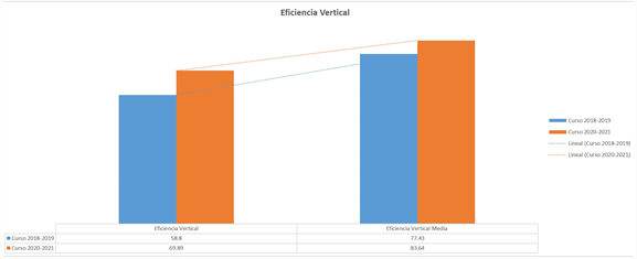 La eficiencia vertical (EV) es un indicador de importancia para la evaluación de la calidad y refleja, para un curso en particular, la proporción de estudiantes de los diferentes años que lograron promover o concluir sus estudios entre los matriculados en ese curso, sin importar su procedencia, y esta también puede ser calculada por ciclos de la carrera denominándose eficiencia vertical media (EVM).13
