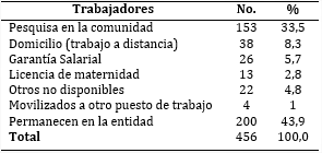De 456 trabajadores, 153 participaron en la pesquisa activa, 200 quedaron en las instalaciones garantizando actividades para actualizar documentos, organizar de trabajo docente, capacitación en temas de covid-19, atender a becarios, cocina comedor, control de electricidad, abastecimiento de agua, entre otras, 38 estuvieron en el trabajo a distancia, seguido de 26 que se encontraban en garantía salarial, 13 disfrutaron la maternidad y 26 trabajadores en otras funciones (tabla 1).