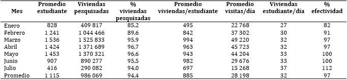 Los resultados que se muestran en la tabla 2 corresponden a las viviendas pesquisadas. Con un promedio de 1 115 estudiantes se logró pesquisar 94,4 % de las viviendas, con un máximo de visitas en los meses de marzo a mayo y mínimo en enero y julio.