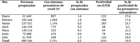 La tabla 3 presenta los resultados de positividad de las personas pesquisadas, el promedio de personas pesquisadas fue mayor en los meses de febrero a mayo, menor en los meses de enero, junio y julio; 5 191 personas con síntomas presuntivos, un pico en marzo con 1 194 nuevos sospechosos. Los individuos con síntomas presuntivos de covid-19 fueron bajos (0,5 %), no siendo así con la confirmación por PCR de las personas sintomáticas 19,9 %. El día de mayor incidencia de casos en la provincia fue el 28 de mayo del 2021.